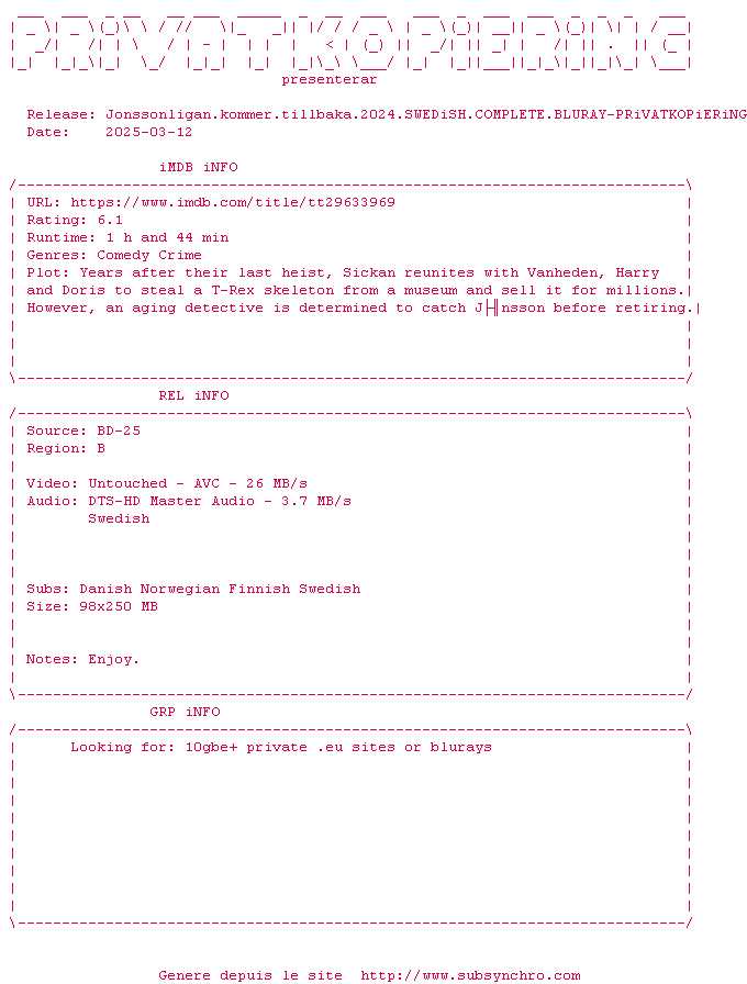 Voir le nfo de la release Jonssonligan.Kommer.Tillbaka.2024.SWEDiSH.COMPLETE.BLURAY-PRiVATKOPiERiNG