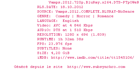 Voir le nfo de la release Vamps.2012.720p.BluRay.x264.DTS-PTpOWeR