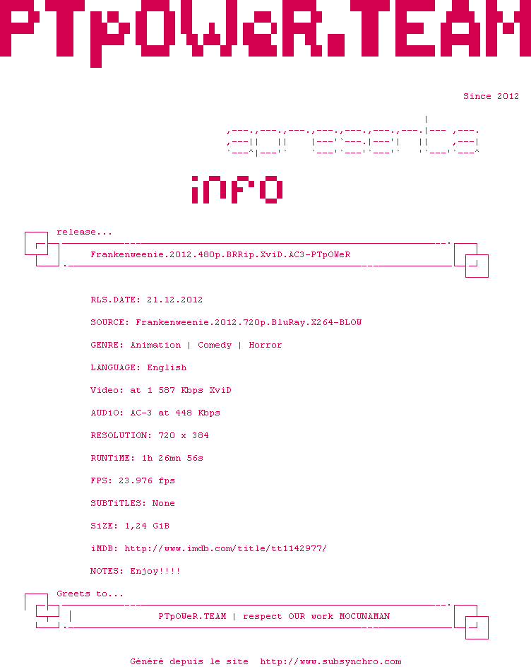 Voir le nfo de la release Frankenweenie.2012.480p.BRRip.XviD.AC3-PTpOWeR