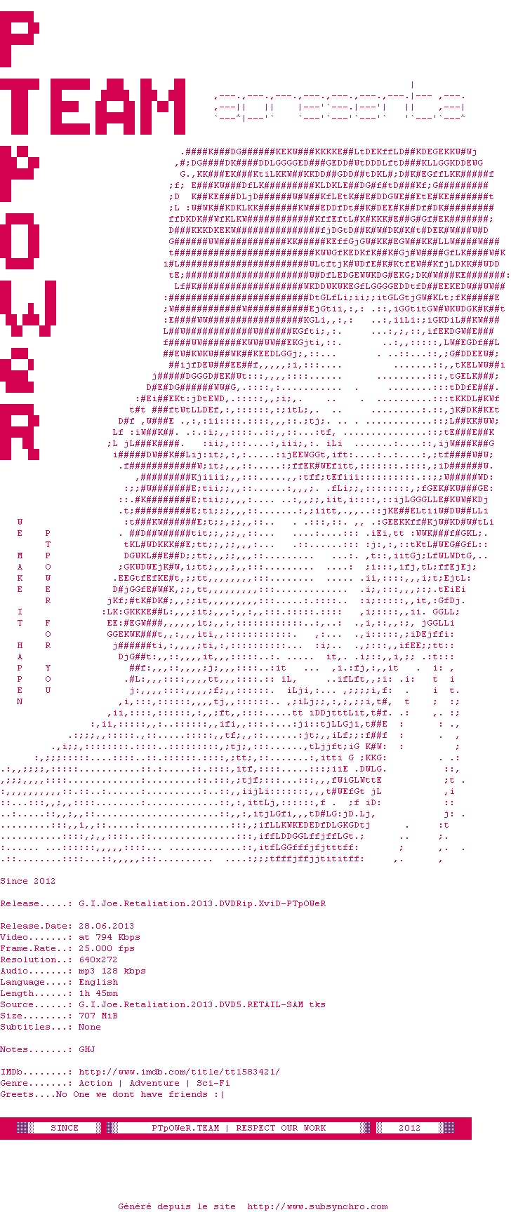 Voir le nfo de la release G.I.Joe.Retaliation.2013.DVDRip.XviD-PTpOWeR