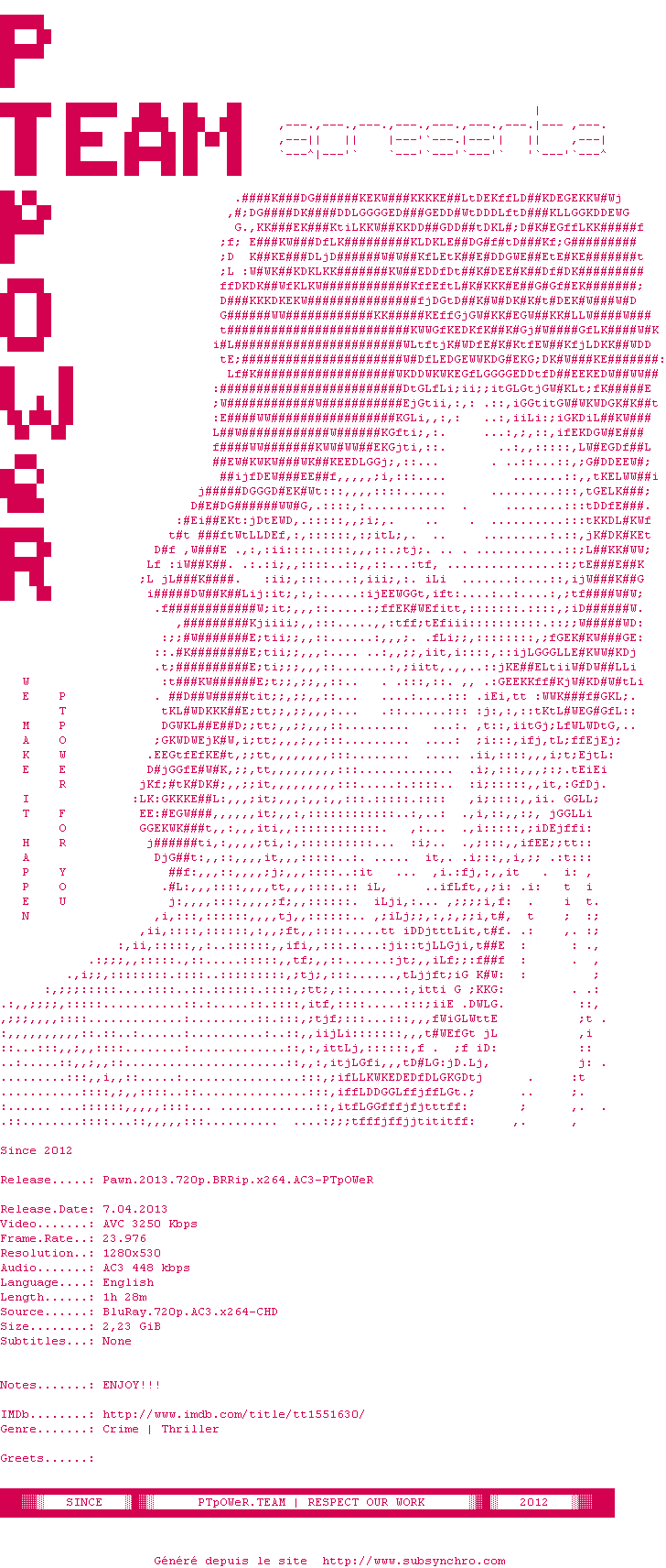 Voir le nfo de la release Pawn.2013.720p.BRRip.x264.AC3-PTpOWeR