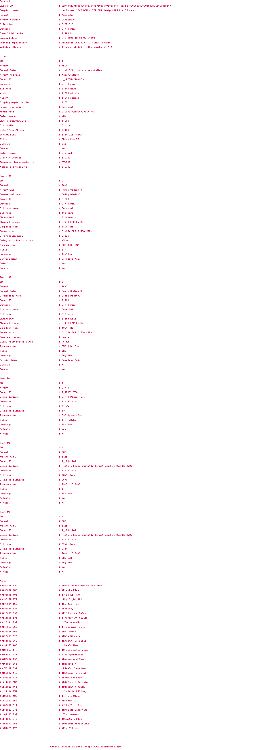 Voir le nfo de la release Mr.Brooks.2007.BDMux.ITA.ENG.1080p.x265-Paso77