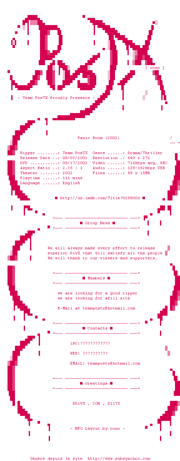 Voir le nfo de la release Panic.Room.DVDrip.DivX-PosTX