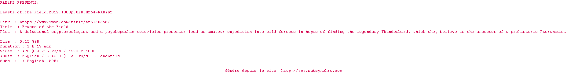 Voir le nfo de la release Beasts.Of.The.Field.2019.1080p.WEB.H264-RABiDS