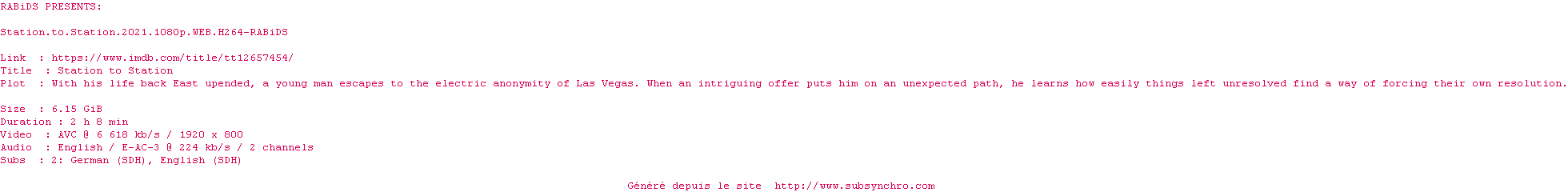 Voir le nfo de la release Station.To.Station.2021.1080p.WEB.H264-RABiDS