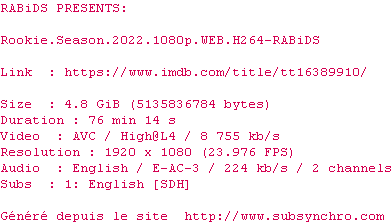 Voir le nfo de la release Rookie.Season.2022.1080p.WEB.H264-RABiDS
