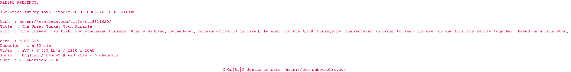 Voir le nfo de la release The.Great.Turkey.Town.Miracle.2023.720p.WEB.H264-RABiDS