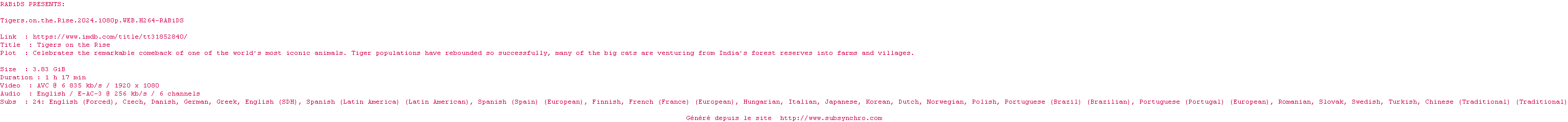Voir le nfo de la release Tigers.On.The.Rise.2024.HDR.2160p.WEB.H265-RABiDS