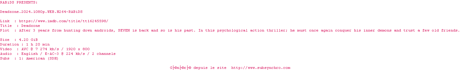 Voir le nfo de la release Deadzone.2024.1080p.WEB.H264-RABiDS