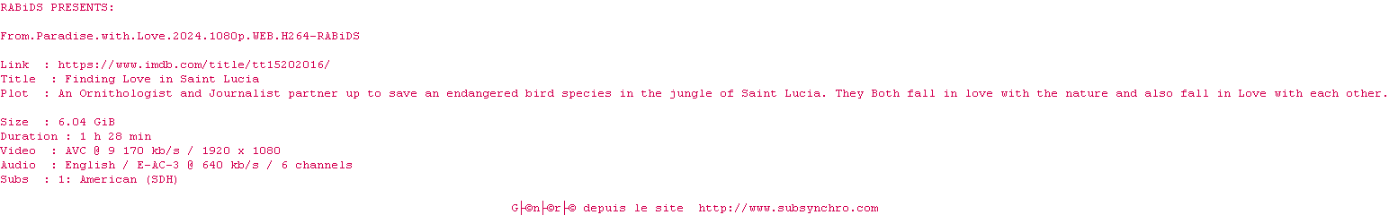 Voir le nfo de la release From.Paradise.With.Love.2024.1080p.WEB.H264-RABiDS