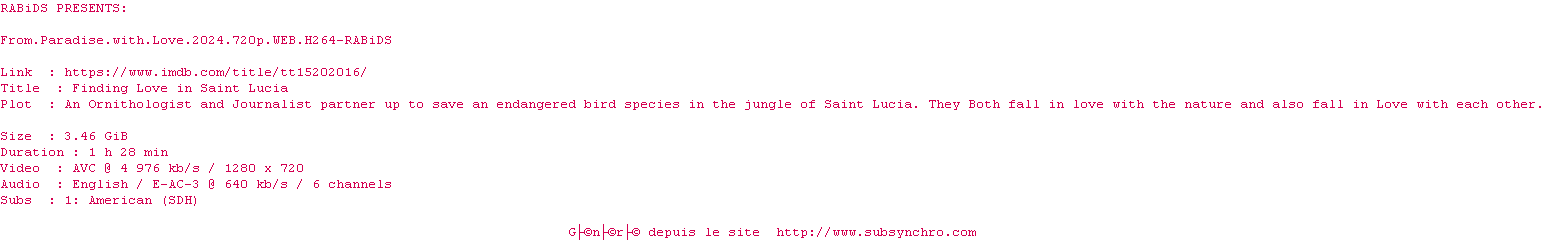 Voir le nfo de la release From.Paradise.With.Love.2024.720p.WEB.H264-RABiDS