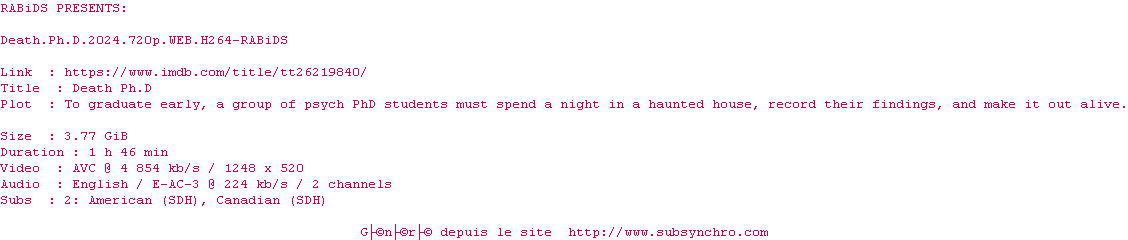 Voir le nfo de la release Death.Ph.D.2024.720p.WEB.H264-RABiDS