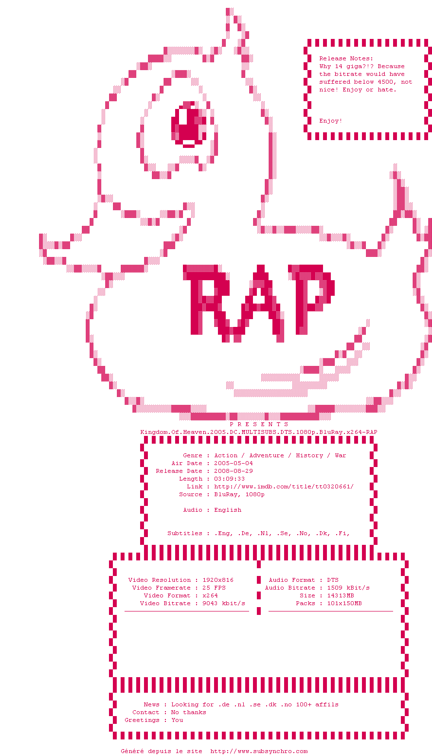 Voir le nfo de la release Kingdom.Of.Heaven.2005.DC.MULTISUBS.DTS.1080p.BluRay.x264-RAP