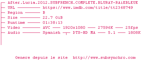 Voir le nfo de la release After.Lucia.2012.SUBFRENCH.COMPLETE.BLURAY-RAiEBLEUE