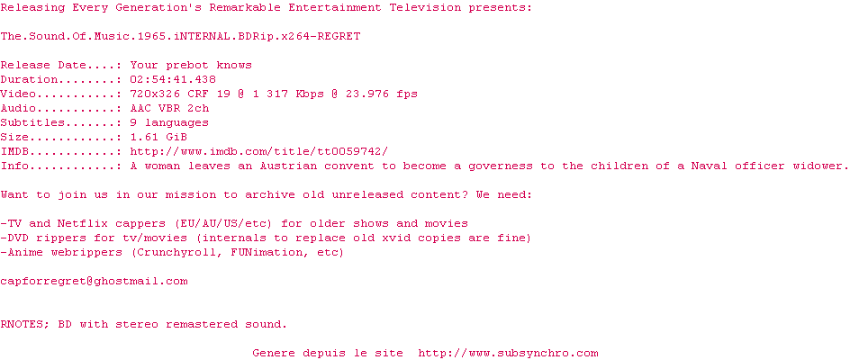 Voir le nfo de la release The.Sound.Of.Music.1965.iNTERNAL.BDRip.x264-REGRET