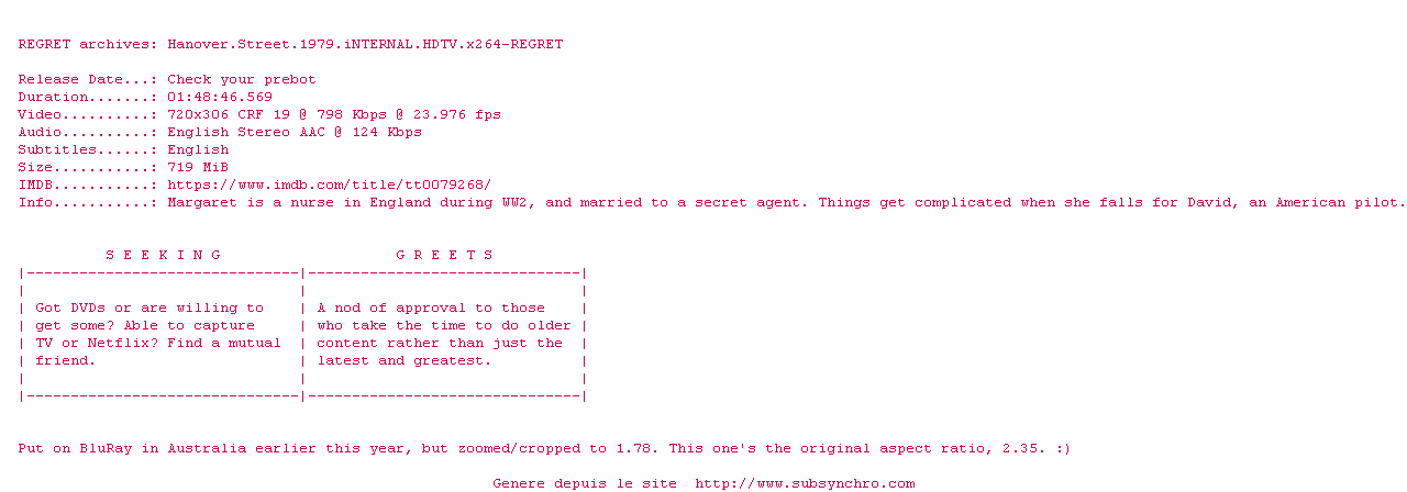 Voir le nfo de la release Hanover.Street.1979.720p.HDTV.x264-REGRET