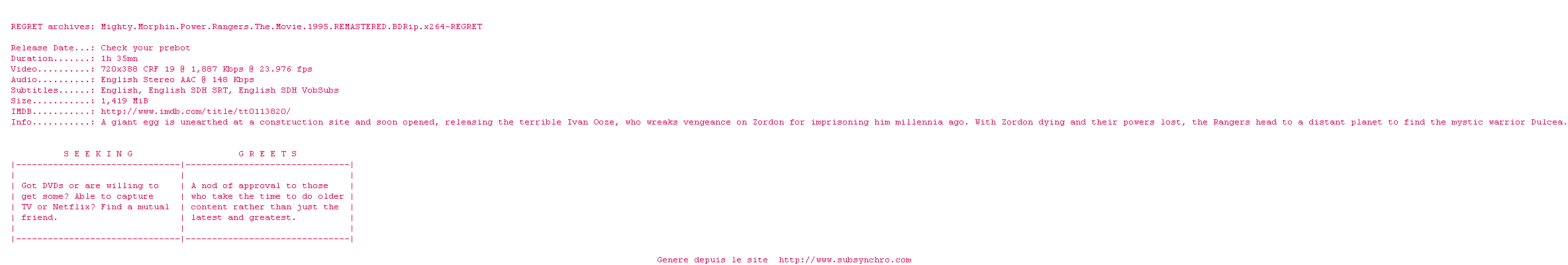 Voir le nfo de la release Mighty.Morphin.Power.Rangers.The.Movie.1995.REMASTERED.BDRip.x264-REGRET
