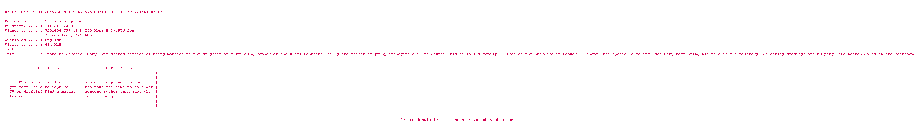 Voir le nfo de la release Gary.Owen.I.Got.My.Associates.2017.720p.HDTV.x264-REGRET