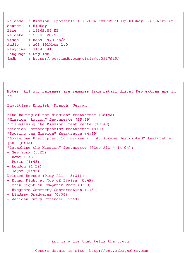 Voir le nfo de la release Mission.Impossible.III.2006.EXTRAS.1080p.BluRay.H264-RMXTRAS