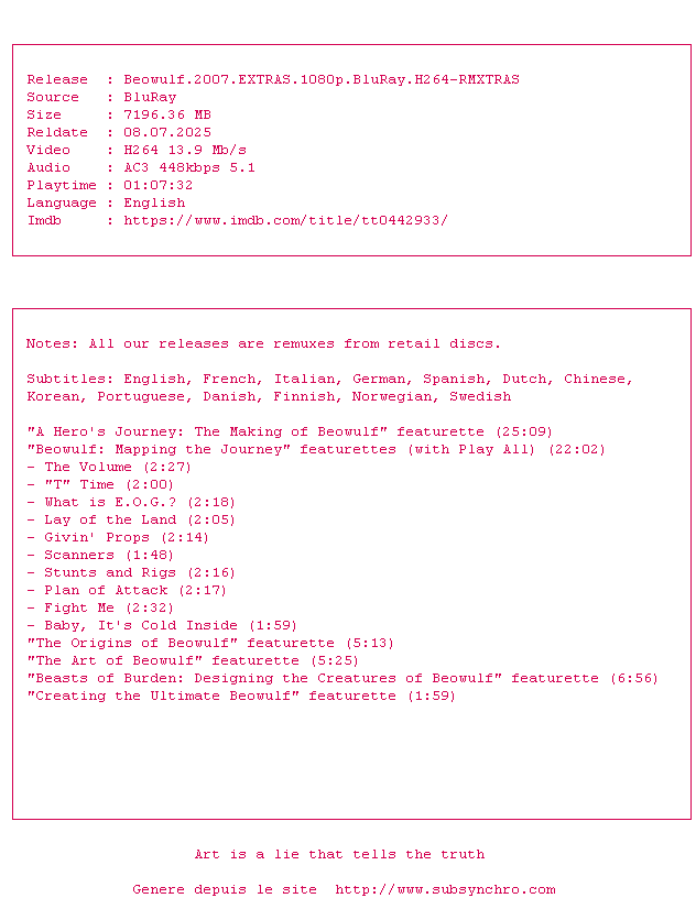 Voir le nfo de la release The.Imaginarium.Of.Doctor.Parnassus.2009.EXTRAS.1080p.BluRay.H264-RMXTRAS