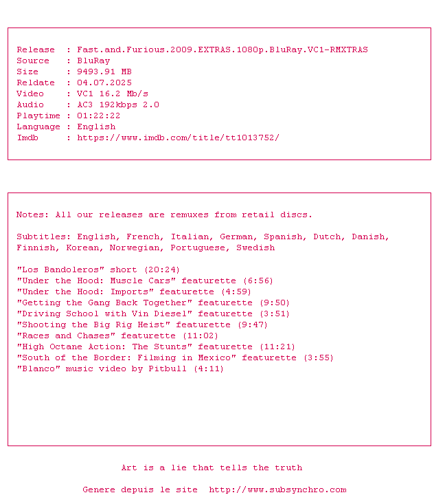 Voir le nfo de la release Fast.And.Furious.2009.EXTRAS.1080p.BluRay.VC1-RMXTRAS