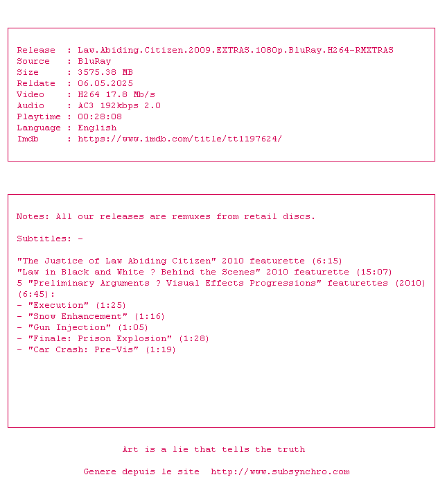 Voir le nfo de la release Law.Abiding.Citizen.2009.EXTRAS.1080p.BluRay.H264-RMXTRAS