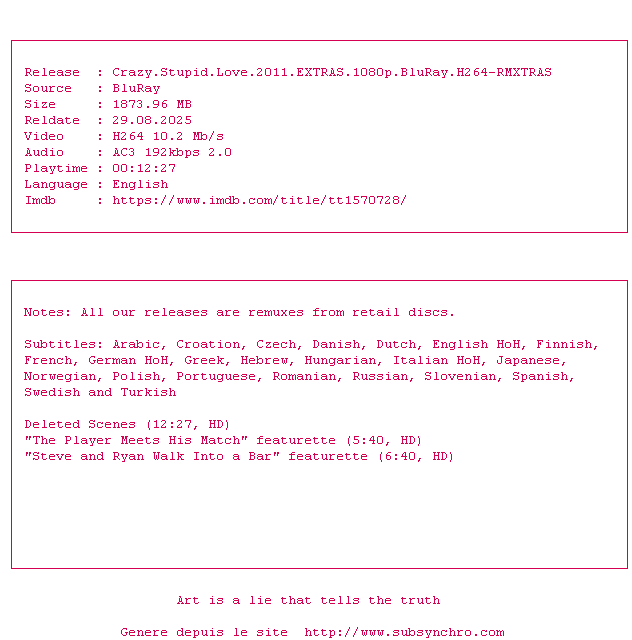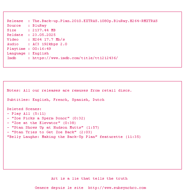 Voir le nfo de la release The.Back-up.Plan.2010.EXTRAS.1080p.BluRay.H264-RMXTRAS