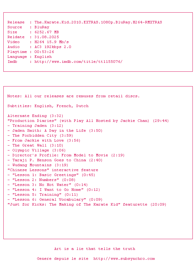 Voir le nfo de la release Star.Trek.2009.EXTRAS.1080p.BluRay.H264-RMXTRAS