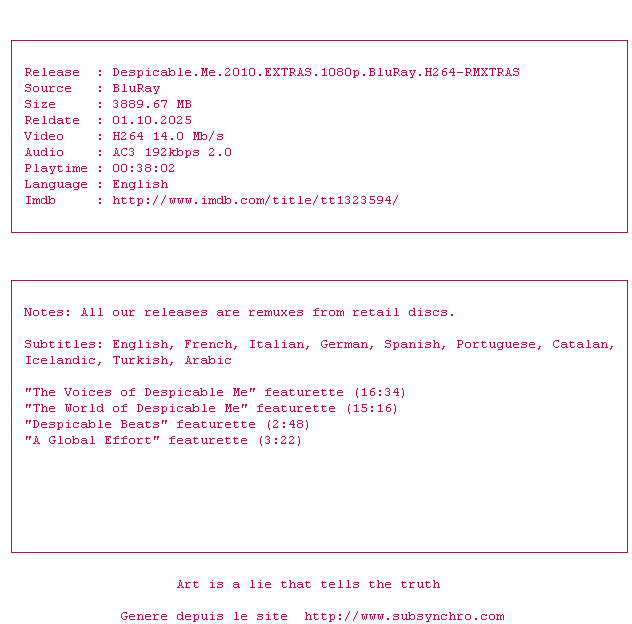 Voir le nfo de la release Spider-Man.3.2007.EXTRAS.1080p.BluRay.H264-RMXTRAS