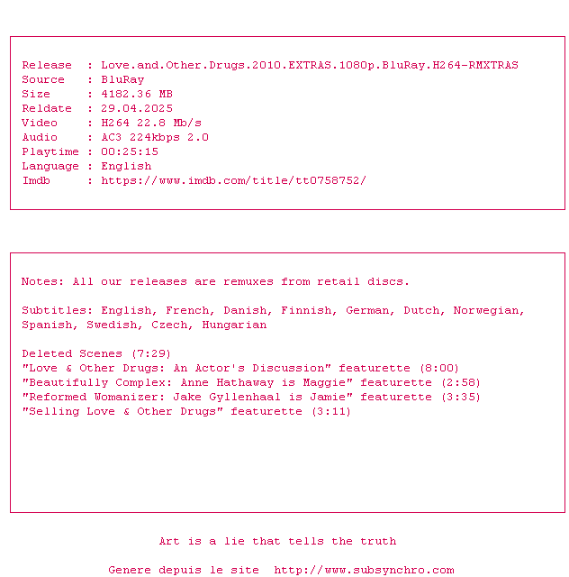 Voir le nfo de la release Love.And.Other.Drugs.2010.EXTRAS.1080p.BluRay.H264-RMXTRAS