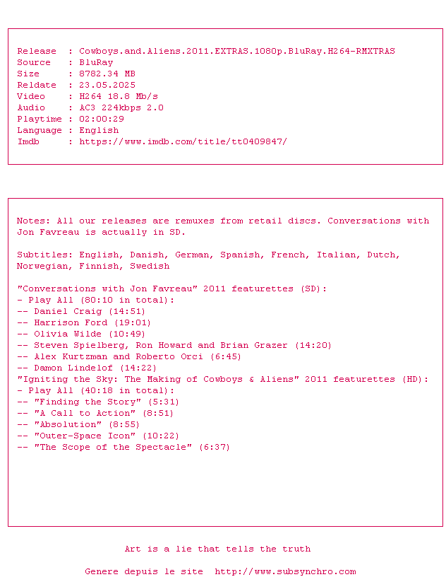 Voir le nfo de la release Cowboys.And.Aliens.2011.EXTRAS.1080p.BluRay.H264-RMXTRAS
