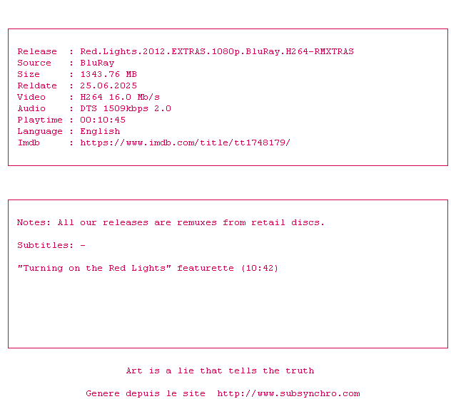 Voir le nfo de la release Red.Lights.2012.EXTRAS.1080p.BluRay.H264-RMXTRAS