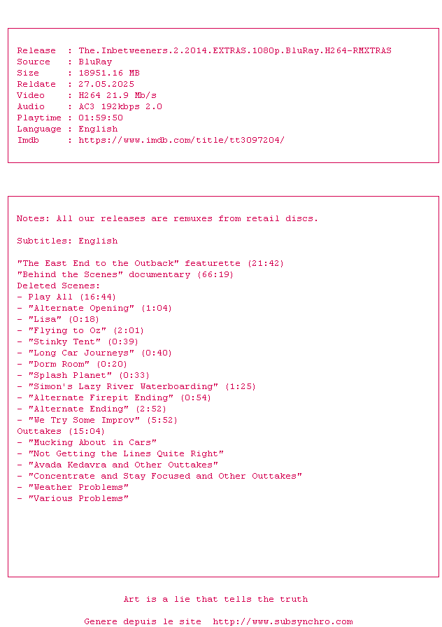 Voir le nfo de la release The.Inbetweeners.2.2014.EXTRAS.1080p.BluRay.H264-RMXTRAS