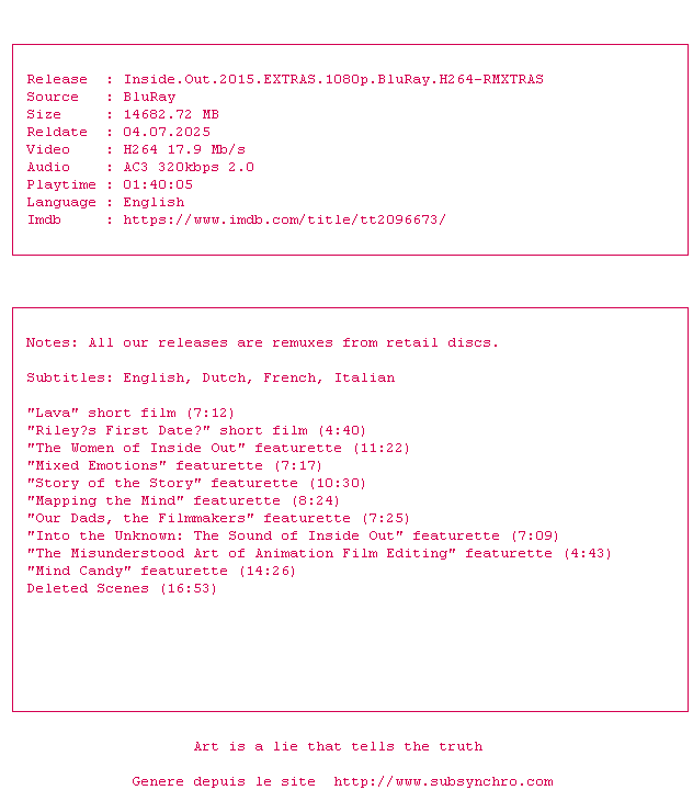 Voir le nfo de la release Inside.Out.2015.EXTRAS.1080p.BluRay.H264-RMXTRAS