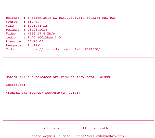 Voir le nfo de la release Exposed.2016.EXTRAS.1080p.BluRay.H264-RMXTRAS