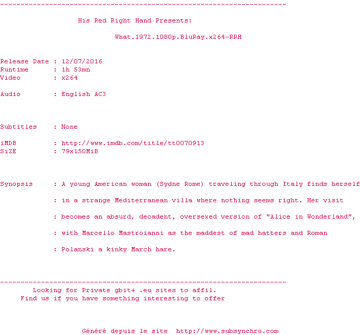 Voir le nfo de la release What.1972.RERiP.1080p.BluRay.x264-RRH