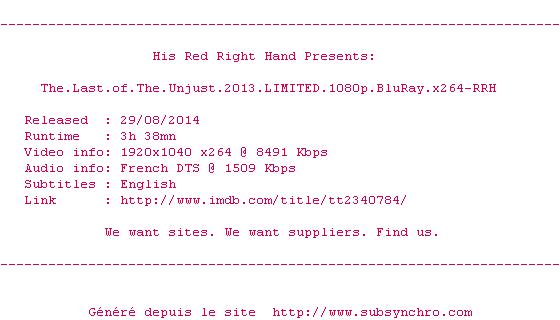 Voir le nfo de la release The.Last.Of.The.Unjust.2013.LIMITED.1080p.BluRay.x264-RRH