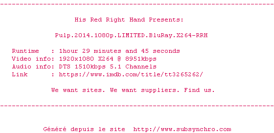 Voir le nfo de la release Pulp.2014.1080p.LIMITED.BluRay.x264-RRH
