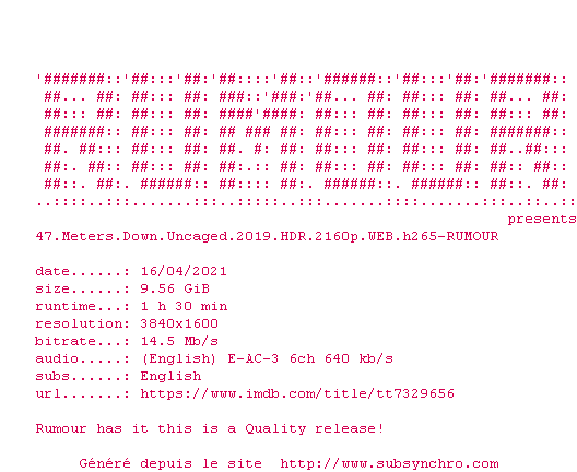 Voir le nfo de la release 47.Meters.Down.Uncaged.2019.HDR.2160p.WEB.H265-RUMOUR