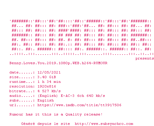 Voir le nfo de la release Benny.Loves.You.2019.1080p.WEB.H264-RUMOUR