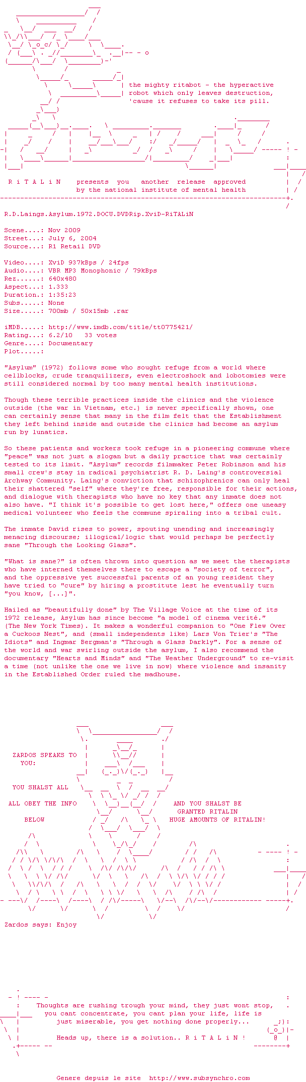Voir le nfo de la release R.D.Laings.Asylum.1972.DOCU.DVDRip.XviD-RiTALiN