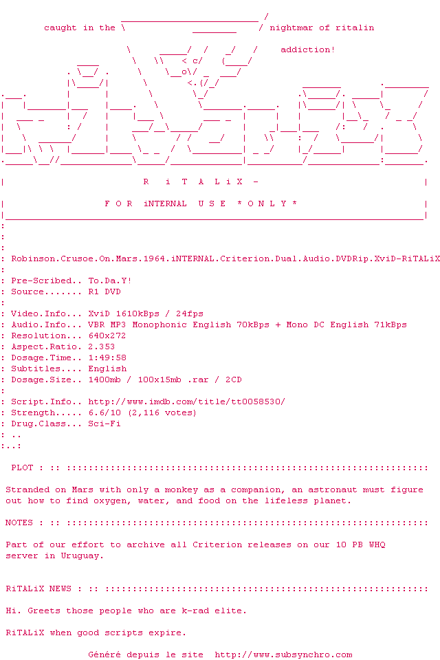 Voir le nfo de la release Robinson.Crusoe.On.Mars.1964.iNTERNAL.Criterion.Dual.Audio.DVDRip.XviD-RiTALiX