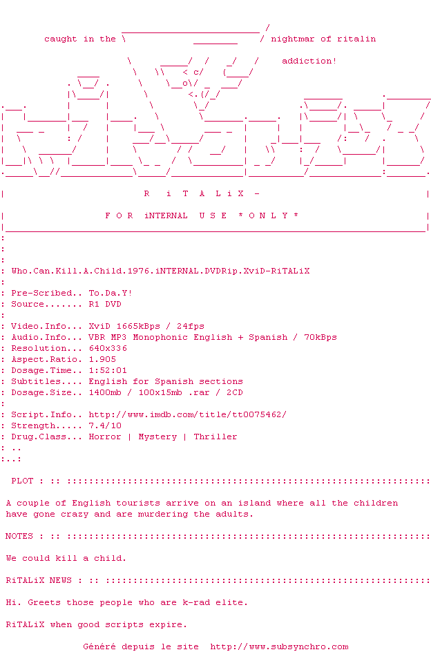 Voir le nfo de la release Who.Can.Kill.A.Child.1976.iNTERNAL.DVDRip.XviD-RiTALiX