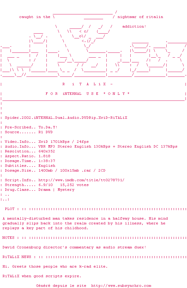 Voir le nfo de la release Spider.2002.iNTERNAL.Dual.Audio.DVDRip.XviD-RiTALiX