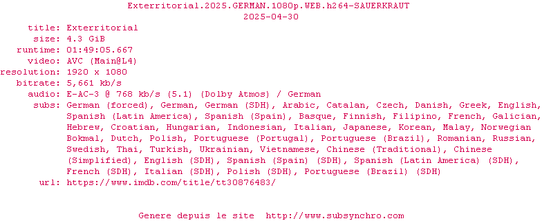 Voir le nfo de la release Exterritorial.2025.GERMAN.1080p.WEB.H264-SAUERKRAUT