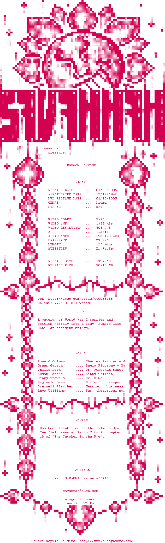 Voir le nfo de la release Random.Harvest.1942.DVDRip.XviD-SAVANNAH