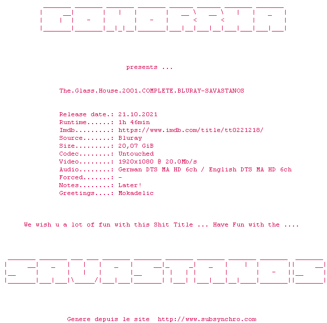 Voir le nfo de la release The.Glass.House.2001.COMPLETE.BLURAY-SAVASTANOS