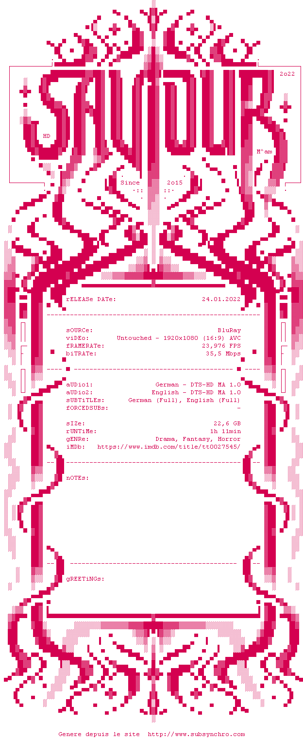 Voir le nfo de la release Hanussen.1988.German.1080p.BluRay.AVC.REPACK-SAViOURHD