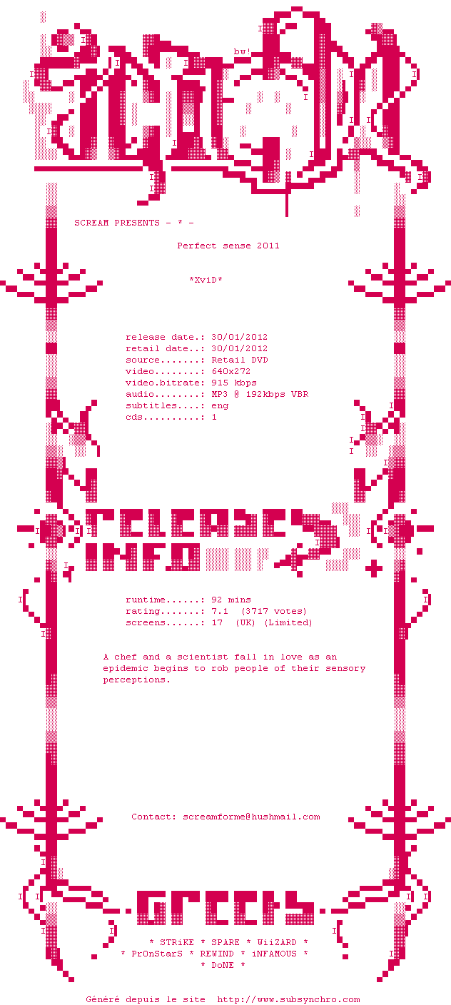 Voir le nfo de la release Perfect.Sense.2011.LiMiTED.DVDRip.XviD-SCREAM