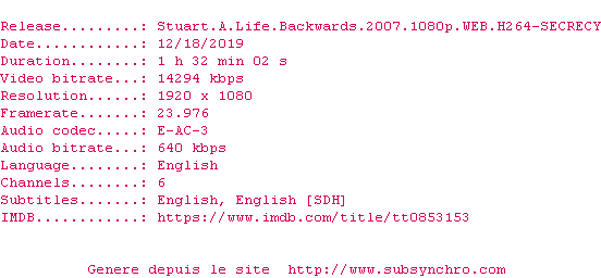 Voir le nfo de la release Stuart.A.Life.Backwards.2007.1080p.WEB.H264-SECRECY